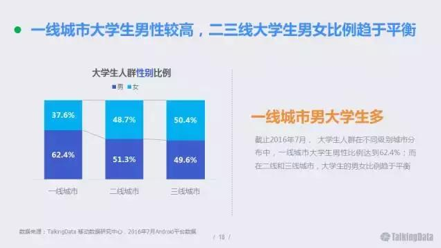 截止2016年7月,大學(xué)生人群在不同級(jí)別城市分布中,一線城市大學(xué)生男性比例達(dá)到62.4%;而在二線和三線城市,大學(xué)生的男女比例趨于平衡