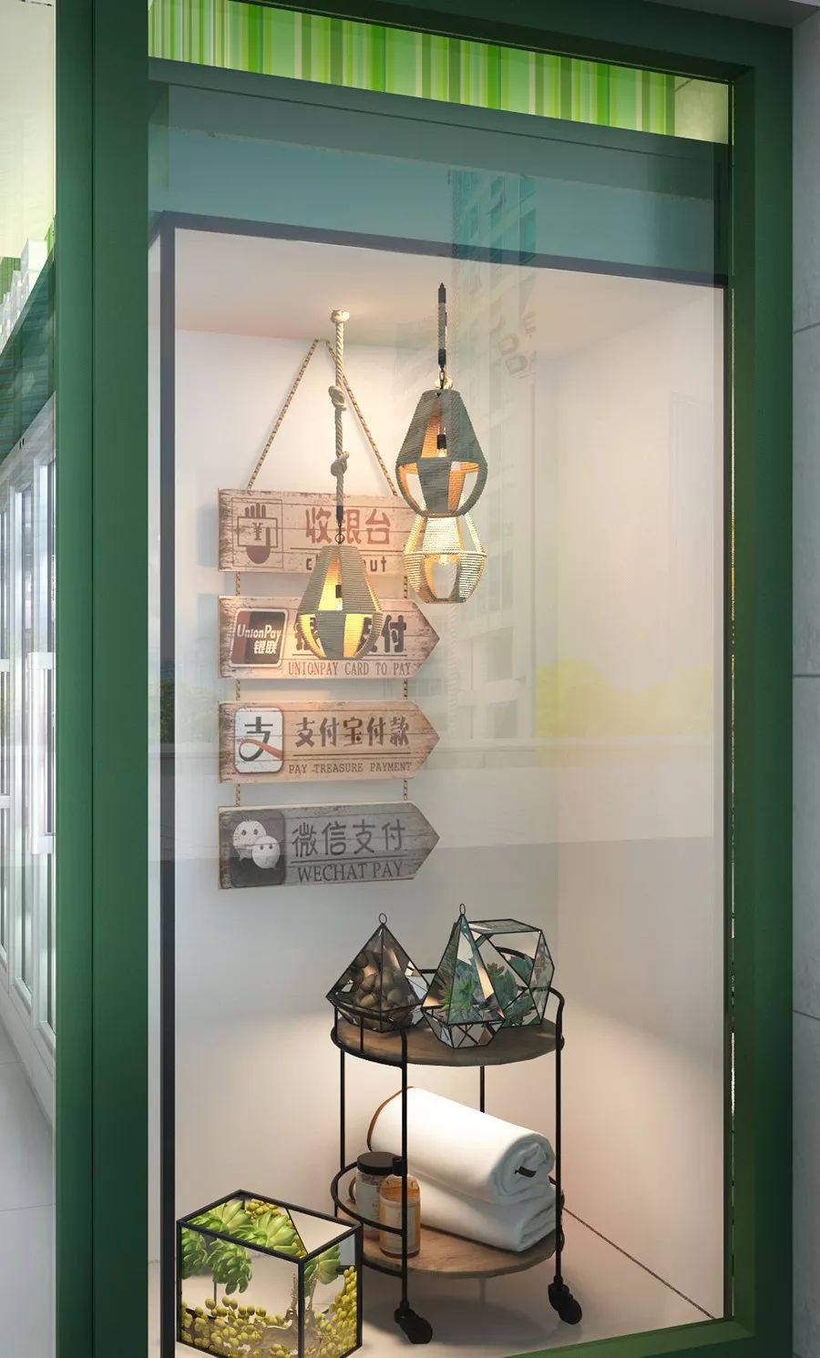 我們首先在門頭立面上揉合了工業(yè)風(fēng)的概念,以鐵藝線框?qū)χ舆M(jìn)行包邊和裝飾,安裝了略帶復(fù)古氣息的工業(yè)風(fēng)壁燈,宛如家門口的燈火、壁爐旁的溫暖,具有一種質(zhì)樸而精致的美感,形成門店獨(dú)特的空間領(lǐng)地,吸引過往行人目光。