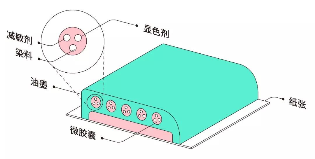 使用的油墨中含有加入特殊染料的微膠囊,只能在特定溫度區間才會顯色,溫度區間可以自由選擇,范圍為10°C。顏色有黃、洋紅、藍、黑等等,注意偶爾有耐光性和耐熱性不佳的問題。