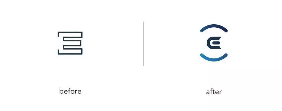 新LOGO縮小了,原本的視覺符號中心“E”的元素,從原本的橫版框線里面提取出來,并給它外圍用弧形的線條包圍起來去呈現。